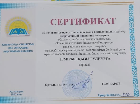 Қызылорда облыстық оқу орталығының (әдістемелік кабинет) ұйымдастыруымен, «Биологияны оқыту процесінде жаңа технологиялық әдістер және оларды тиімді пайдалану жолдары» шеберлік сыныбына әріптесіміз Темірбекқызы Гүлнұр қатысып,