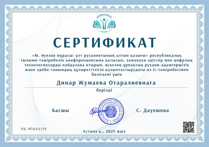 Астана қаласының Білім басқармасы "Әдістемелік орталығы" және Семей қаласы М. Әуезов атындағы педагогикалық колледжі бірлесе ұйымдастырған ҚР Оқу-ағарту министрлігі мен Ы. Алтынсарин атындағы Ұлттық білім академиясы қатысуымен өткен "М. Әуезов мұрасы: ұлт руханиятының алтын қазығы" республикалық ғылыми-тәжірибелік конференциясына әріптесіміз Жумаева Динар қатысып, "М.Әуезов және ұлттық тәрбие: тарихи жады мен ұрпақ сабақтастығы" тақырыбында өз тәжірибесімен бөлісіп, сертификатпен марапатталды!