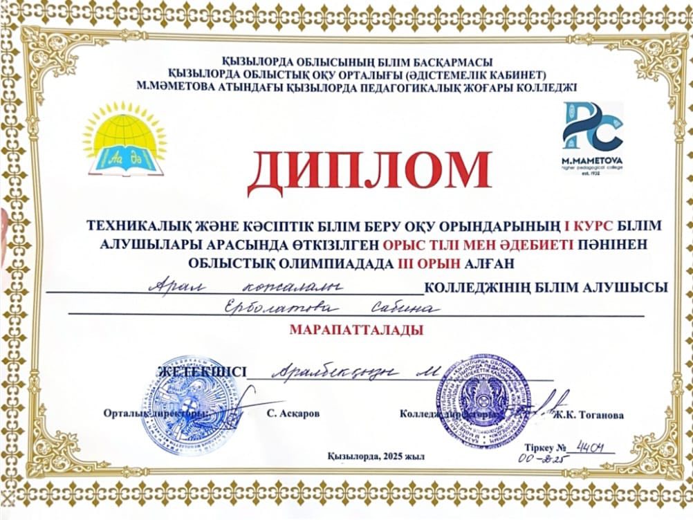 Қызылорда облыстық оқу орталығы (әдістемелік кабинет) мен М.Мәметова атындағы Қызылорда педагогикалық жоғары колледжінің ұйымдастыруымен техникалық және кәсіптік білім беру оқу орындарының 1-курс білім алушылары арасында өткізілген облыстық олимпиададан орыс тілі мен әдебиеті пәнінің оқытушысы М.Аралбекқызының жетекшілігімен, колледжіміздің студенті Ерболатова Сабина III орын алды. Сондай-ақ төмендегі пәндер бойынша студенттеріміз сертификаттармен марапатталды:/p> Қазақ тілі мен әдебиеті пәні бойынша Қуантқанқызы Аружан Жетекшісі: Қазақ тілі мен әдебиеті пәнінің оқытушысы А.Байтуреева Шетел тілі (ағылшын)пәнінен Сабыржанқызы Нұрай Жетекшісі: Ағылшын тілі пәнінің оқытушысы Ұ.Алдасбергенова Математика пәнінен Қуанышбаев Айболсын Жетекшісі: Математика пәнінің оқытушысы М.Махамбетрзаева Информатика пәнінен Ұзақбаев Ерасыл Жетекшісі: Информатика пәнінің оқытушысы З.Тажибаева География пәнінен Орынбаева Еркеназ Жетекшісі: География пәнінің оқытушысы Г.Серикбаева Әріптестеріміз бен студенттерімізге болашақта да шығармашылық табыс, жаңа жетістіктер тілейміз!
