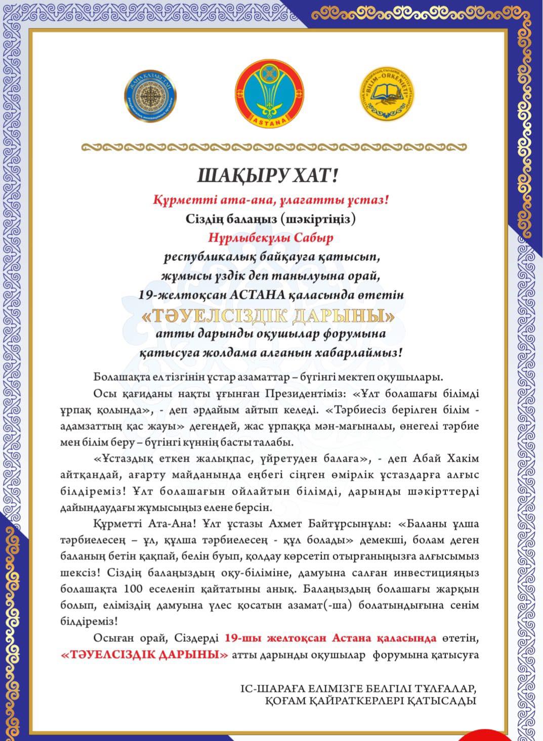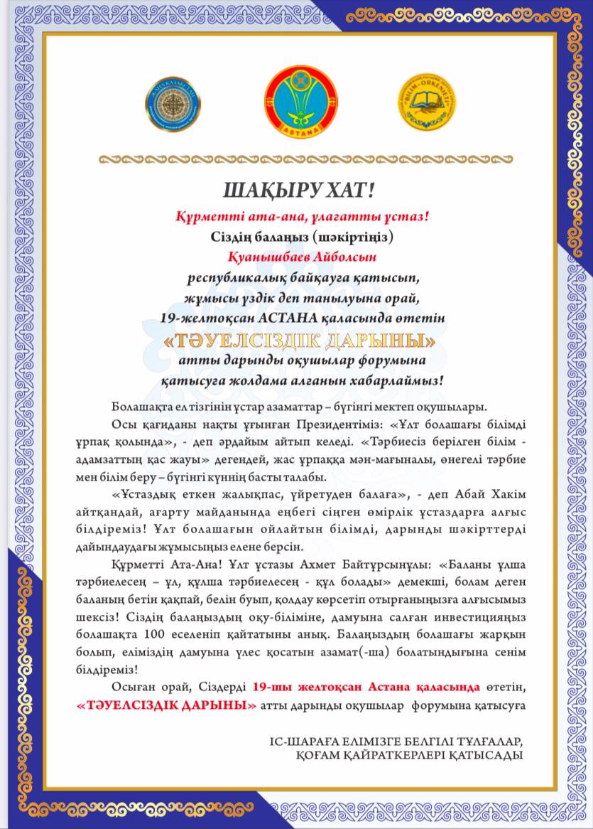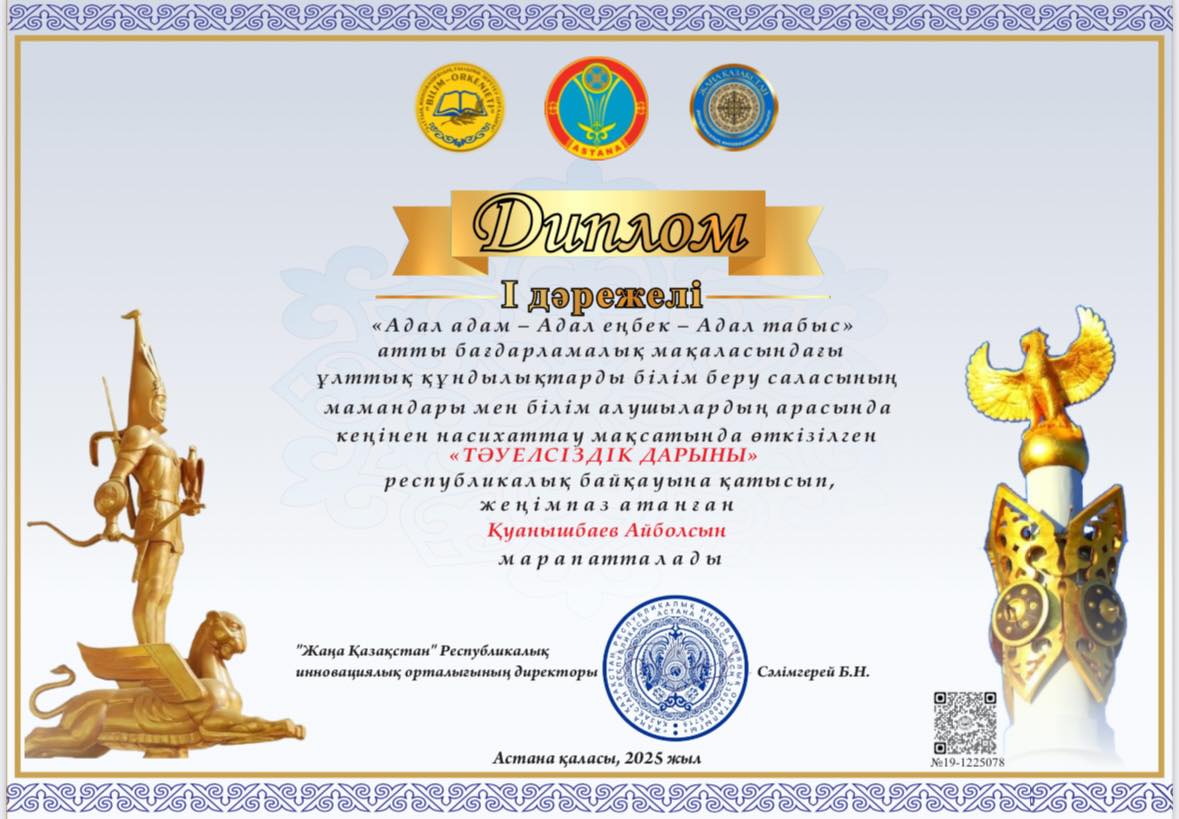 "Жаңа Қазақстан" Республикалық инновациялық орталығы ұйымдастырған республикалық «ТƏУЕЛСІЗДІК ДАРЫНЫ» байқауына Г.Жансүгірованың жетекшілігімен колледжіміздің студенттері Қуанышбаев Айболсын мен Нұрлыбекұлы Сабыр қатысып, 1-орынға ие болды!
