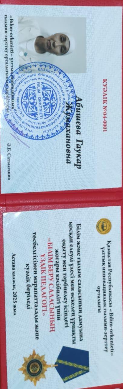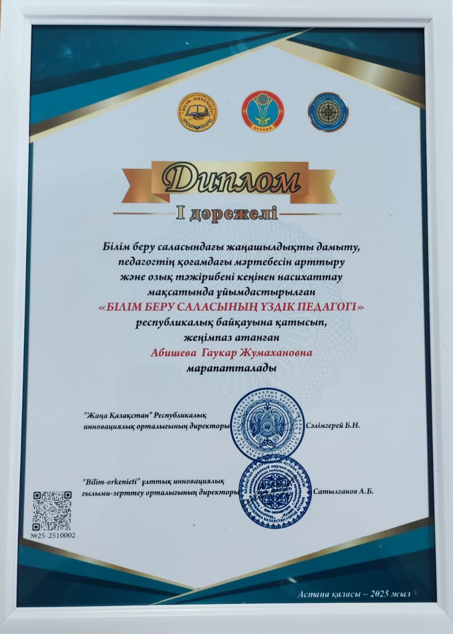 «Bilim-Orkenieti» ұлттық инновациялық ғылыми-зерттеу орталығының ұйымдастыруымен өткізілген, білім беру саласындағы жаңашылдықты дамыту, педагогтің қоғамдағы мәртебесін арттыру және озық тәжірибені кеңінен насихаттау мақсатында ұйымдастырылған «БІЛІМ БЕРУ САЛАСЫНЫҢ ҮЗДІК ПЕДАГОГІ» республикалық байқауына қатысып, арнайы пән оқытушысы Г. Абишева жеңімпаз атанды.