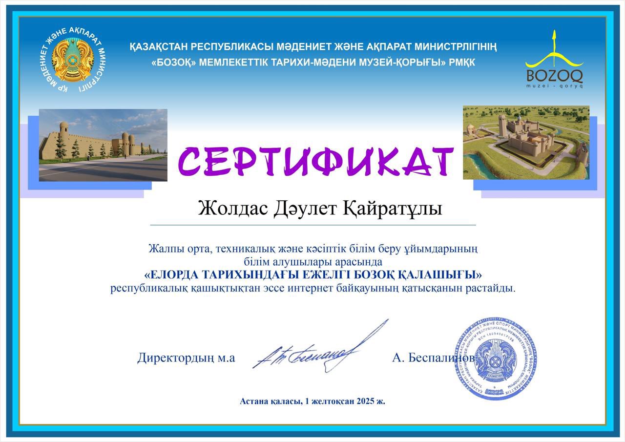 Республикалық қазыналық кәсіпорын — Қазақстан Республикасы Мәдениет және ақпарат министрлігінің Мәдениет комитеті ұйымдастырған «Елорда тарихындағы ежелгі Бозоқ қалашығы» атты эссе байқауына колледж студенттері Сабыржанқызы Нұрай, жетекшісі - Ғалия Серикбаева және Жолдас Дәулет жетекшісі – Асылгүл Унайбекова қатысып, сертификаттарға ие болды